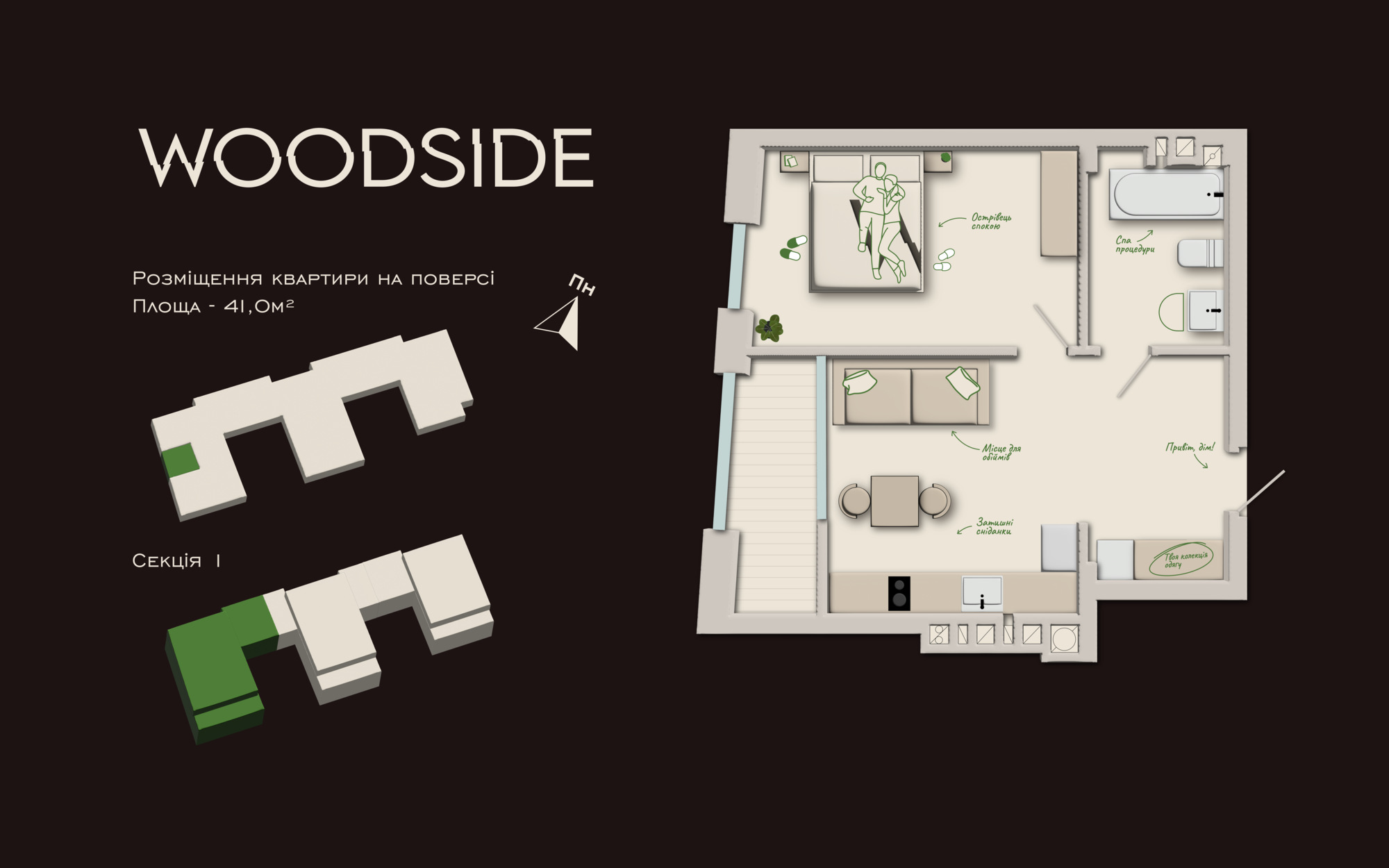 Затишна квартира з продуманим плануванням: кухня-вітальня, окрема кімната та зручний санвузол. Засклена лоджія та вікна виходять на приватний сектор, даруючи приємний краєвид і тишу. Лоджія стане ідеальним місцем для відпочинку будь-якої пори року або додатковим простором для зберігання й облаштування домашнього куточка.