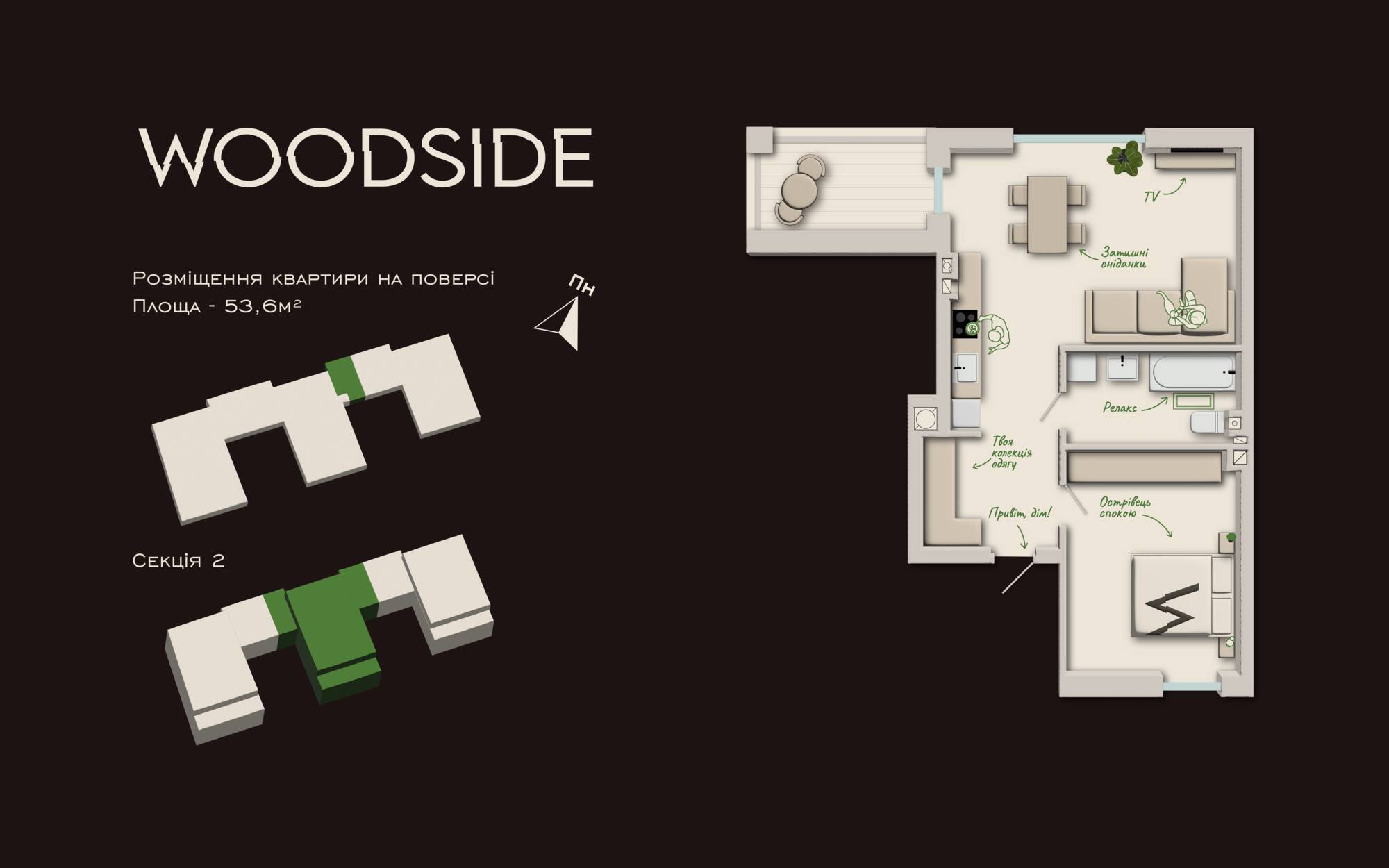 Квартира 53,6 м² із функціональним плануванням — тут легко розмістити все необхідне. А балкон стане тим самим куточком, де можна видихнути зранку з кавою чи провести вечір на повітрі.