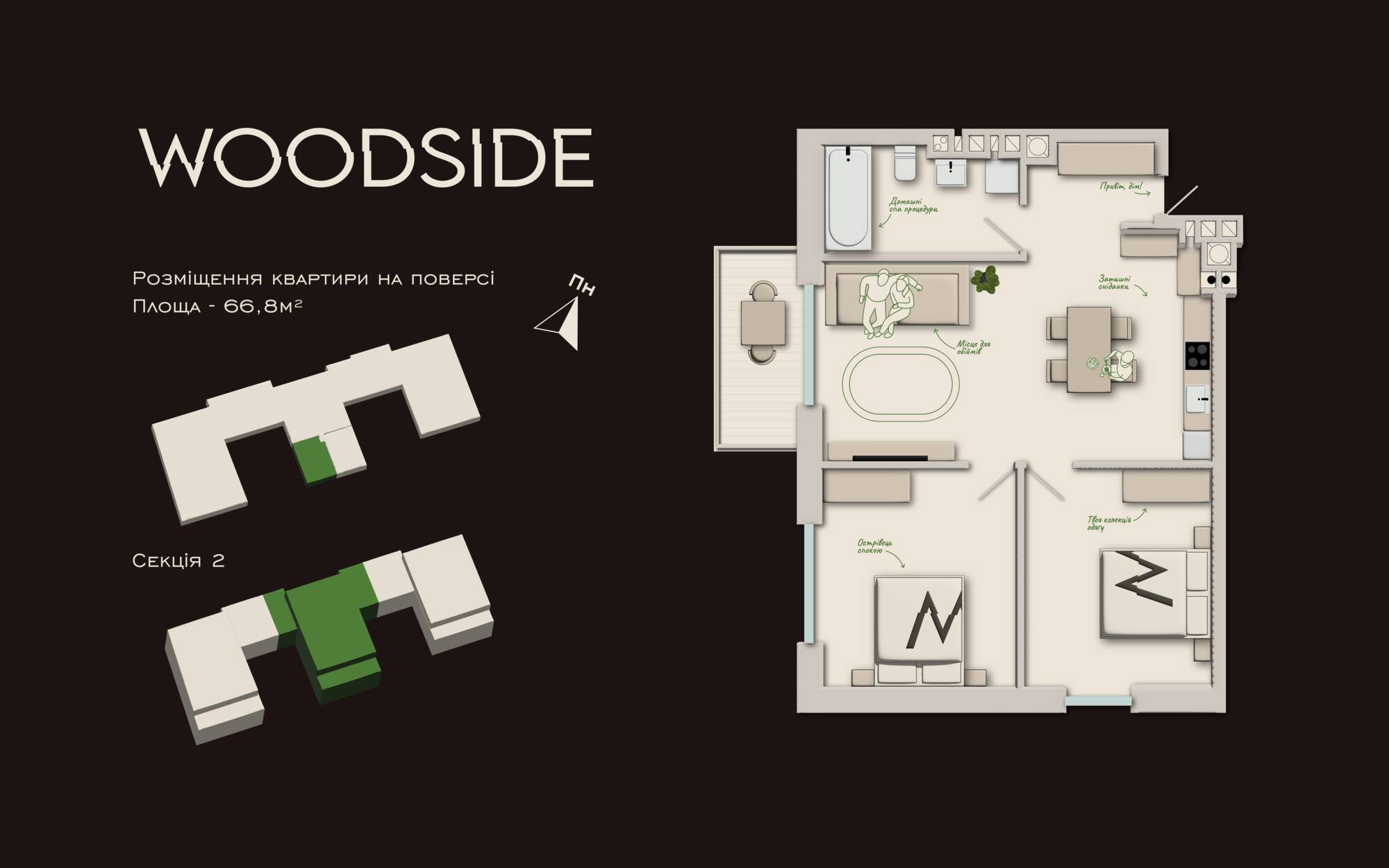 Затишна квартира з продуманим плануванням: велика кухня-вітальня, дві окремі кімнати та санвузол. Тераса й вікна виходять у тихий двір, наповнюючи оселю світлом і створюючи відчуття домашнього затишку щодня.