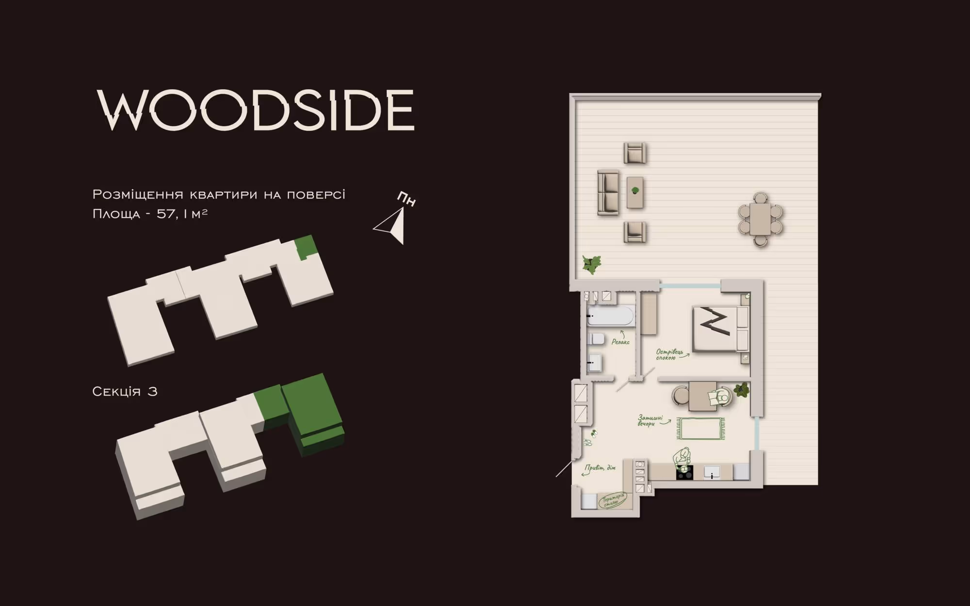 У цій квартирі продумано кожен м². Фішка планування — велика тераса із виходом і з кухні, і зі спальні. А головне — вона виходить прямо в ліс. Ідеальне місце для вечірнього відпочинку або дружніх посиденьок під шум дерев.