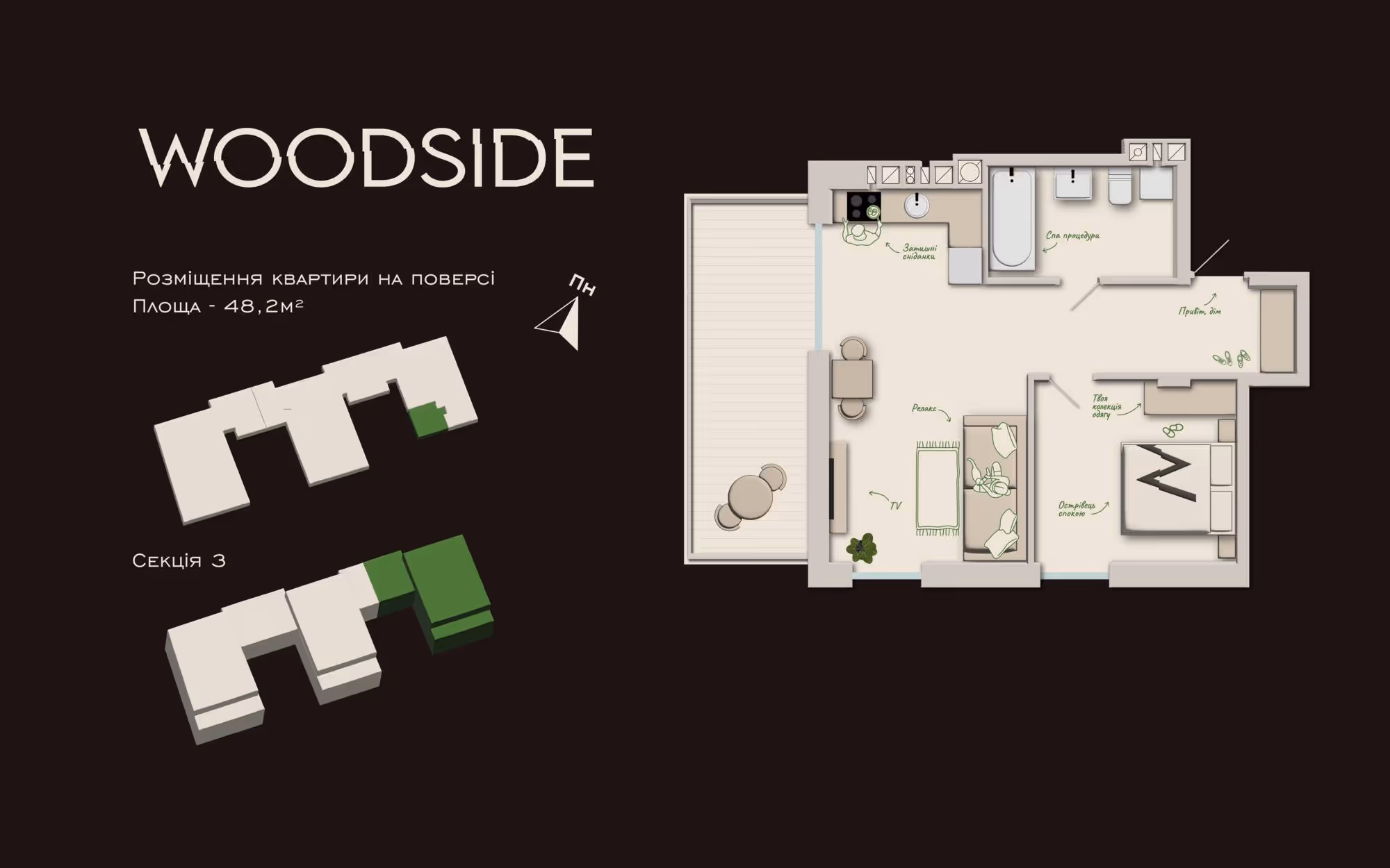 Світла квартира з однією спальнею, кухнею-вітальнею та терасою. Вона розширює простір і дарує відчуття власного невеликого дворику. Ідеальний варіант для тих, хто хоче мати всі переваги міста й водночас насолоджуватись ароматом лісу.