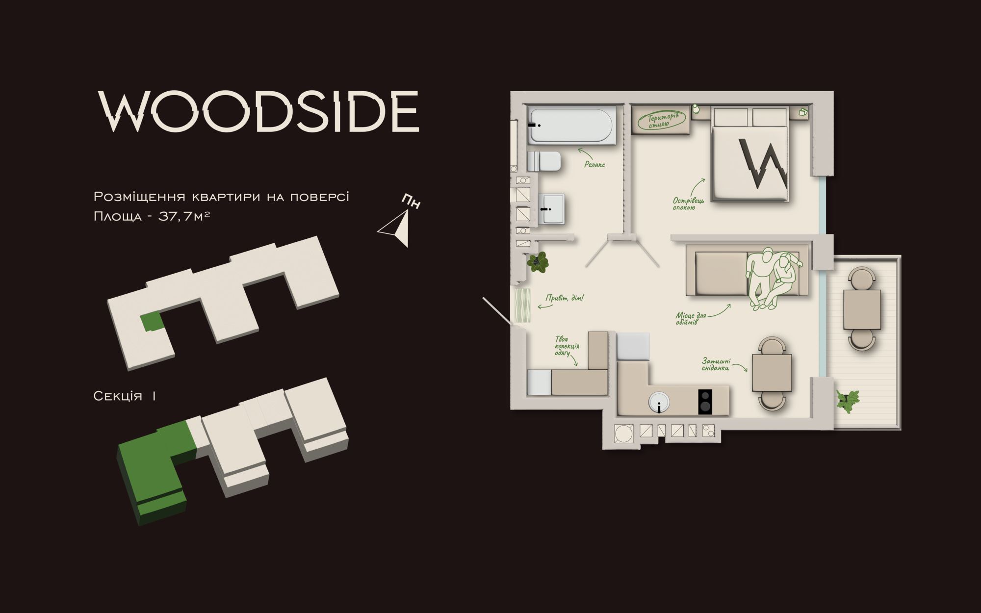 Стильна квартира з продуманим плануванням: кухня-вітальня для затишних вечорів, окрема кімната для відпочинку та комфортний санвузол. Балкон з другого поверху дарує спокійний краєвид на внутрішній двір, а вікна наповнюють простір м’яким денним світлом. Ідеально для тих, хто цінує комфорт і приватність.
